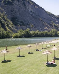 Wat onze camping echt bijzonder maakt, is de directe, privétoegang tot de rivier de Ardèche. Het strand, aan de voet van de camping, is een rustige plek waar je heerlijk kunt zwemmen, zonnen of gewoon naar de stroming kunt kijken. Kinderen kunnen er veilig in het water spelen terwijl ouders ontspannen op de kiezels of in de schaduw van de bomen. Het is ook het ideale startpunt voor een kanotocht richting de Gorges. Op elk moment van de dag is die nabijheid van zoet water een echte luxe voor wie direct contact met de natuur zoekt, zonder in te leveren op het comfort van een hoogwaardige accommodatie. Door natuurlijke zwempartijen af te wisselen met het waterpark van onze camping in de Ardèche beleef je iets unieks: een dubbele waterwereld, zowel natuurlijk als aangelegd.